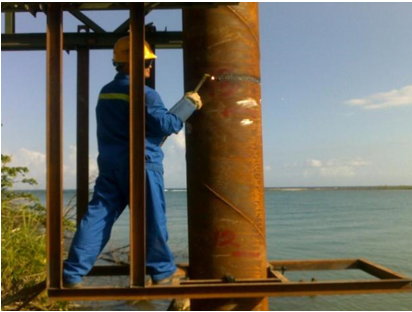C、履帶吊大鉤吊住振動錘(在錘頭系根麻繩),小鉤將鋼管樁吊起放直,下放振動錘,通過工人牽動麻繩,調整夾具位置,使夾具準確牢固夾住鋼管樁。